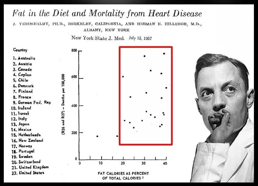 安塞·基斯在撰写报告时,有意对实验数据进行了筛选!他仅仅选择了跟自己假说相符的一小部分数据,其他的都被他选择性忽略了。